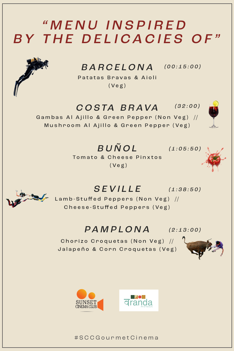 From Barcelona to Costa Brava, Seville to Pamplona, with a detour to the Tomatina festival, Sunset Cinema Club is ready to take you on a sensory journey across Spain. We follow the 'three musketeers' as they embark on a trip that is nothing short of a visual treat. We’ve curated a Spanish-tasting menu that follows the story as it unfolds showcasing various regions of Spain.