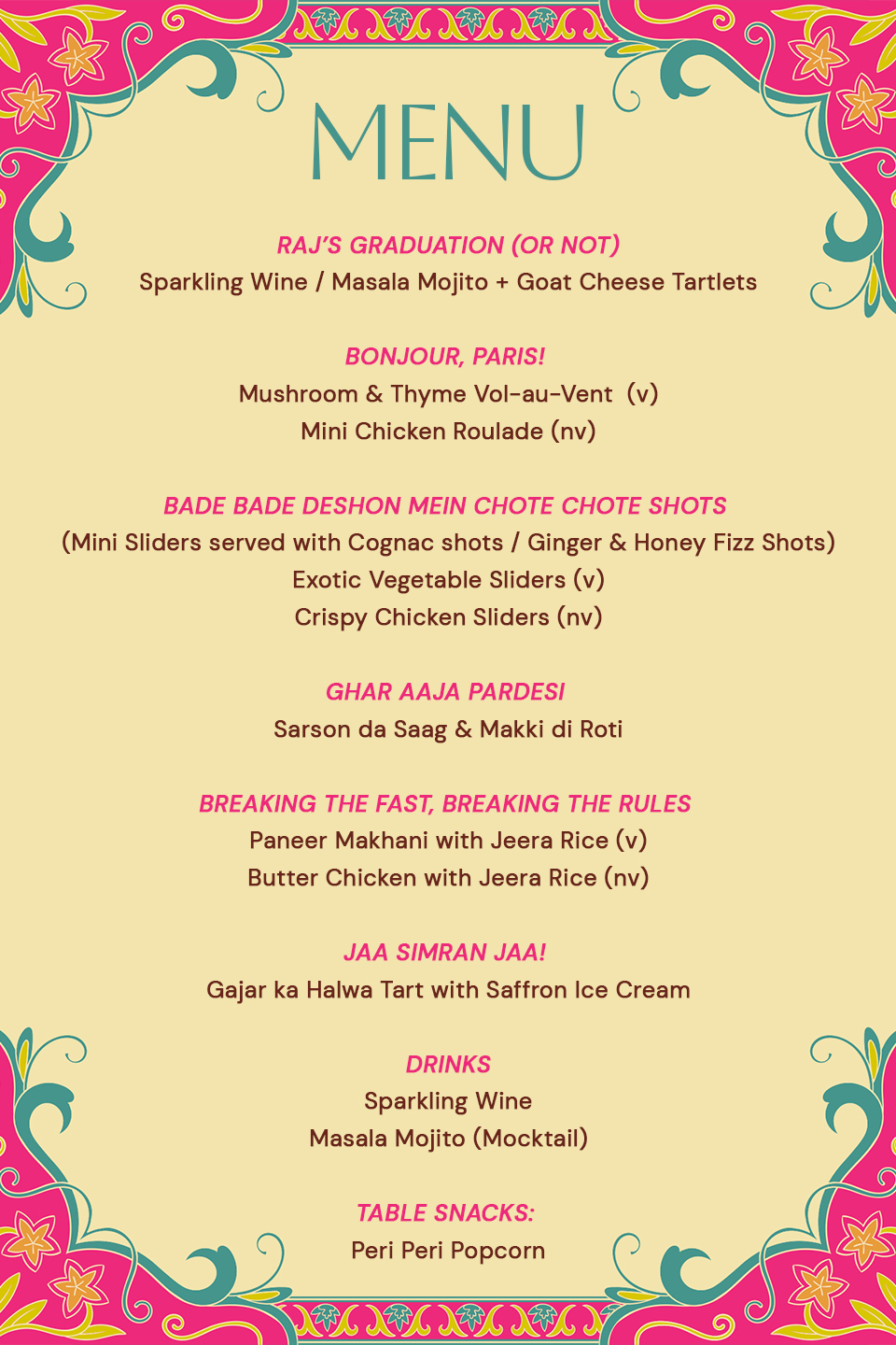Relive this classic with a 5-course tasting menu inspired by the film’s most memorable moments and flavors - from hearty desi favorites that evoke home and family, to playful global touches that echo the adventure and charm of young love. Each course is designed to unfold in rhythm with the story, blending nostalgia, flavor, and feeling into one unforgettable experience.