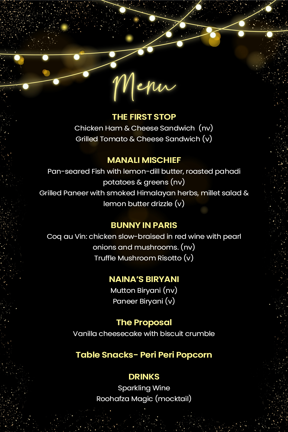 Indulge in a 5-course tasting menu inspired by Bunny and Naina’s unforgettable adventures - from mountain comfort food and homely warmth to playful global influences that mirror the movie’s zest for life. Each course is thoughtfully paired to complement key moments from the film, blending taste, travel, and emotion into one immersive experience.